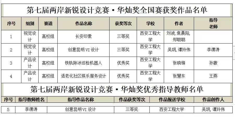 第七届两岸新锐设计竞赛,华灿奖颁奖仪式,4月2日以线上线下相结合的方式举办,海峡两岸共计33153件作品参赛再创新高。本届竞赛还组织了“中国高等教育博览会”“北京礼物”“华灿运河·吴门望亭”“蒲公英中学‘学校即博物馆’文创产品”等定向主题的作品征集,帮助设计作品更好与产业融合,实现市场转化。本届华夏奖以“融·合”为主题,海峡两岸及港澳地区参赛作品33153件,较去年增长185%,参赛类别有视觉传达设计、数字多媒体设计、产品设计、工艺美术、空间设计等,经过海峡两岸及港澳地区的专业评委,产业评委评审,共计评出获奖作品911件,其中我校suncitygroup太阳新城17级产品设计专业学生刘波、焦晨阳、郑聪聪的《长安印象》作品获视觉组三等奖;视觉传达设计专业学生吴玥、谭玲伟的作品《创意昆明VI设计》(指导教师:李渭涛)获视觉组三等奖;工业设计专业学生张晓锋《铁轨除冰巡检机器人》作品(指导教师:孙薇)获产品设计组优秀奖;产品设计专业张慧东作品《适老化社区娱乐服务设计》(指导教师:王燕)获产品设计组优秀奖;李渭涛老师获优秀指导教师奖,为我校获得荣誉。