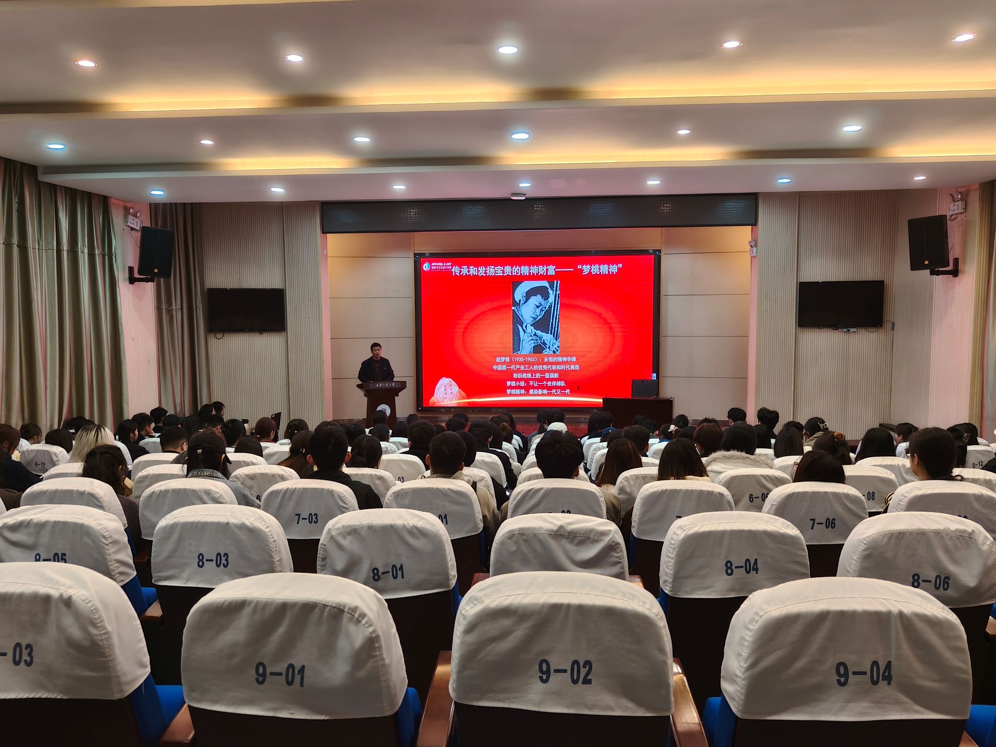 任军以“赓续梦桃精神勇担时代使命”为核心主题,结合中国纺织工业发展历程,生动还原了第一代纺织人赵梦桃在西北国棉一厂细纱车间的奋斗经历与感人事迹。他详细解读了“高标准、严要求、行动快、工作实”的作风内涵,以及“不让一个伙伴掉队”的团队精神在专业学习、设计创作中的现实价值,引导学生将精益求精的工匠精神转化为实干动力,深刻领会这一精神背后蕴含的坚守与担当。