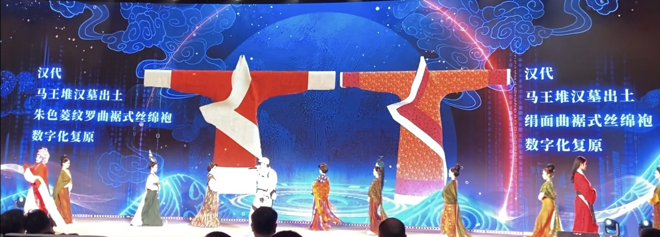 舞台之上,我校服装表演团队身着高度还原的历朝服饰优雅登场,衣袂翩跹间,勾勒出千年服饰美学的传承轨迹。依托我校建设的“中国传统服饰三维数据库”,沉睡千年的服饰珍品被成功“唤醒”。马王堆汉墓出土的曲裾式素纱单衣、绢面曲裾丝绵袍,中国丝绸博物馆藏唐代仙人跨鹤纹绫袍等,经由数字化复原技术,化作流光溢彩的虚拟霓裳,惊艳“破屏”,在数字光影中重焕新生。说唱歌手身着各类高科技穿戴设备炫酷助阵,古今交融、科技赋能,充分展现了我校在传统服饰研究与数字化创新领域的丰硕成果,彰显了西工程人传承文化根脉、勇立创新潮头的使命担当。