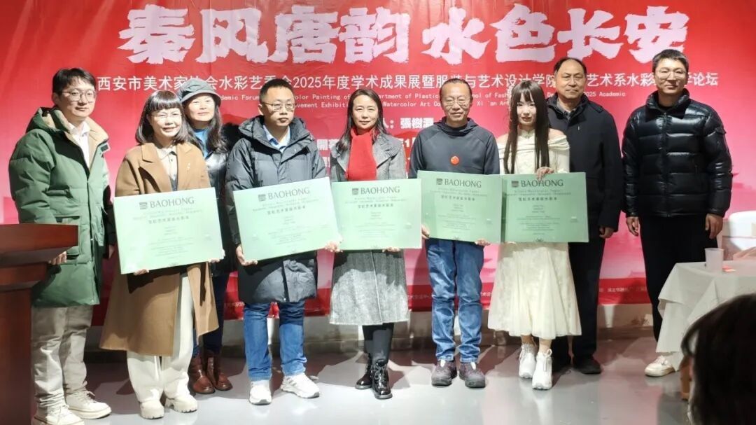 本次展览共收到投稿作品300余幅,入选展出优秀水彩作品百余幅,既有深耕水彩领域数十年的资深名家也有崭露头角的新锐力量作品参展,其中包括学院造型系师生的20余幅优秀水彩画作品。作品中题材丰富多元,风格各具特色,每一幅都凝聚着创作者的匠心与思考,既有对传统技法的传承坚守,也有对当代表达的大胆探索。同步举办的水彩画教学论坛,立足高校美术教育前沿,聚焦教学实践,坚持“以赛带教,以展促交流”,为业界搭建起交流经验、碰撞思想的专业平台。本次展览还设置了奖项及奖品,suncitygroup太阳新城造型艺术系被评为“西安市美术家协会水彩艺委会2025年度学术成果展”团体一等奖。现场嘉宾分别为获奖单位、作者颁发了奖品和证书。本次展览将持续展出至1月20日。