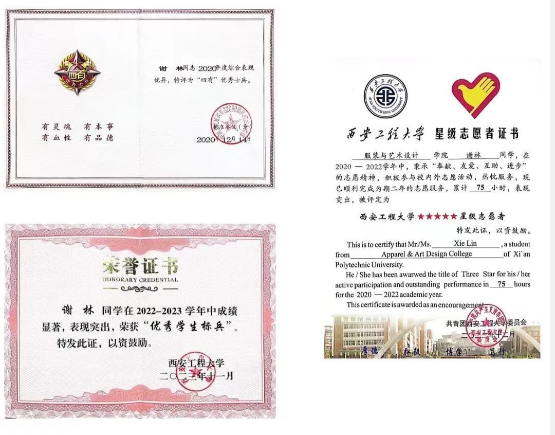在校期间,谢林学长获得了若干奖项。本科生国家奖学金、桑麻一等奖学金、太阳集团城官网一等奖学金数次,同时获得校级优秀学生标兵、优秀学生、优秀团干部、五星级志愿者等荣誉称号,并在2019年申请实用新型专利一项。在校期间参加过诸多比赛,获蓝桥杯第13届国赛优秀奖、第14届省赛三等奖;第11届未来设计师全国高校数字艺术设计大赛陕西赛区一等奖、三等奖;2023赛季东方设计奖国赛三等奖等奖项。在参军期间,获32090部队“四有”优秀士兵及嘉奖。