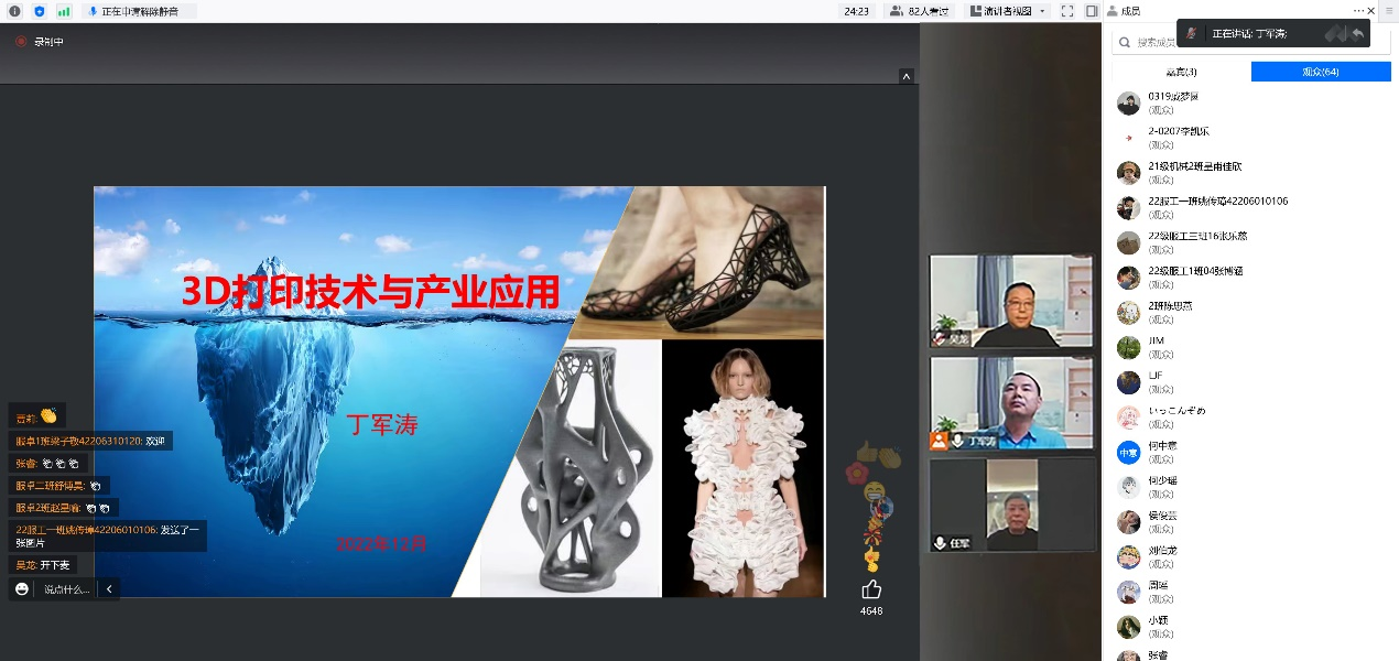 suncitygroup太阳新城服装工程系于12月9日周五晚上19:30在腾讯线上会议召开主题为《3D打印技术与产业应用》的服装工程系专业导师团活动。此活动邀请渭南领智三维科技有限公司副总经理、高级工程师丁军涛,会议由服装工程系副主任吴龙老师主持,服装工程系师生60余人线上参加会议。