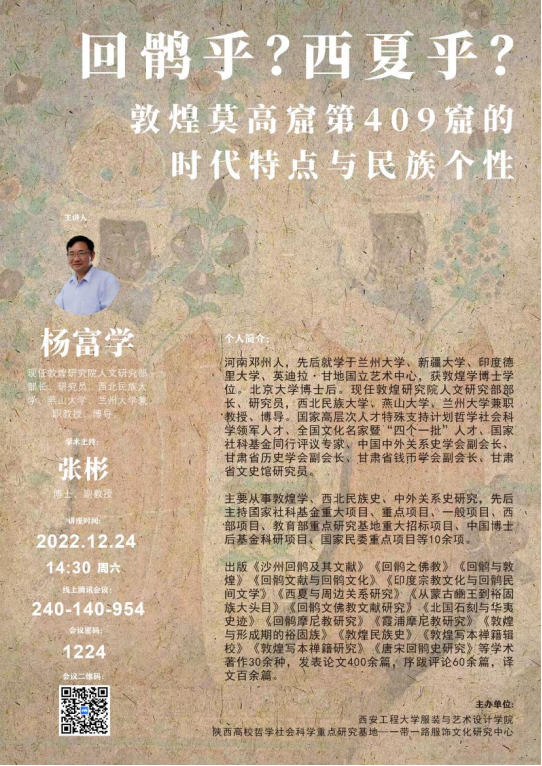 11月24日下午,围绕丝绸之路民族学领域中“敦煌回鹘史”方面的研究,我院举办了一场学术讲座,本场特别邀请到了敦煌研究院人文研究部部长、研究员,西北民族大学、燕山大学、兰州大学兼职教授、博导杨富学老师。他以“回鹘乎?西夏乎?·敦煌莫高窟第409窟的时代特点与民族个性”为主题进行了精彩报告,会议由张彬副教授主持。两个小时的讲座结束后,与会师生进行了同样精彩的交流互动环节。