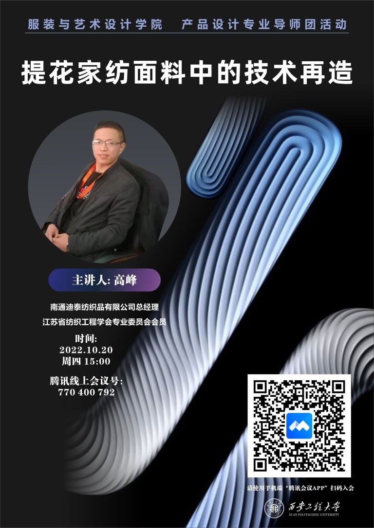 suncitygroup太阳新城产品设计系于10月20号15:00在腾讯会议召开产品设计专业导师团活动。此活动特邀我校优秀校友、江苏省纺织工程学会专业委员会会员、南通市创新人才、南通迪泰纺织品有限公司总经理高峰工程师为产品设计专业全体师生进行《提花家纺面料中的技术再造》的主旨讲座,会议由产品设计系肖红老师主持,产品设计系教师及本科生300余人参加会议。