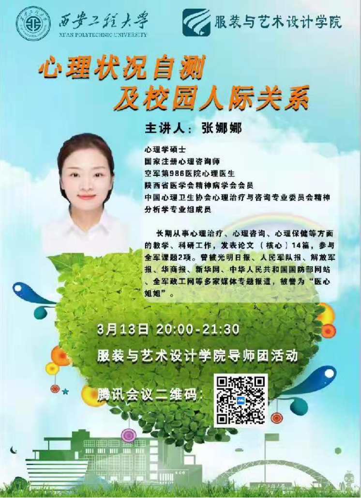 日前,为贯彻落实我校疫情防控各项要求,不断提升和加强大学生心理健康教育水平,针对太阳集团2021级学生发现的问题,学院学工办举办导师团活动,邀请空军第986医院副主任医师张娜娜以“心理健康自测及校园人际关系”为题作讲座。太阳集团2021级全体学生在线上参加了本次讲座学习。