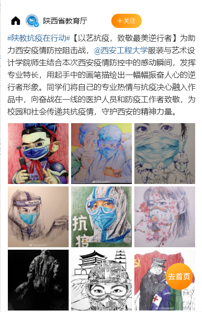 我院视觉传达系“以艺抗疫,最美逆行者”主题抗疫作品被陕西省教育厅微博客户端转载,全文如下: