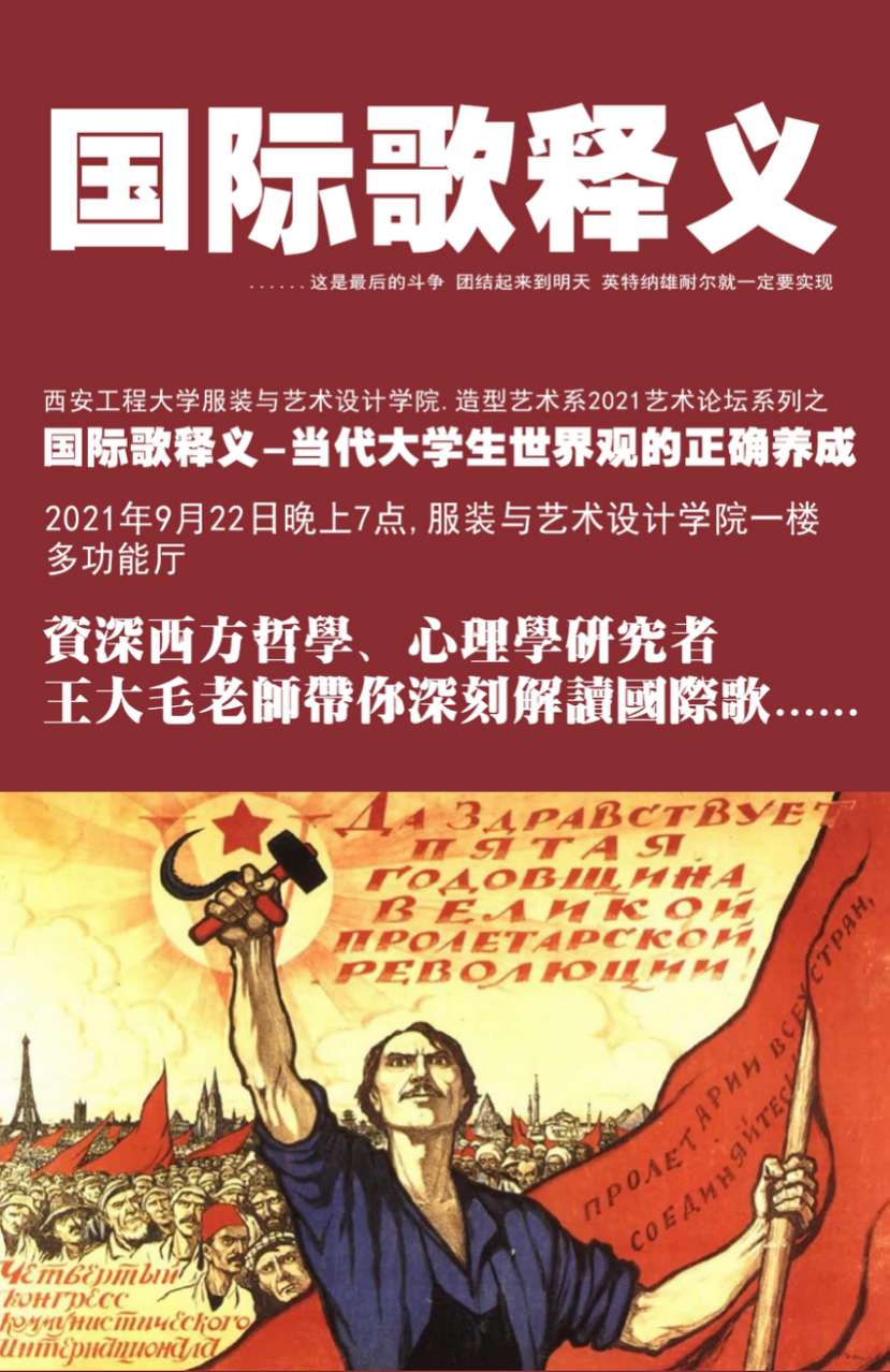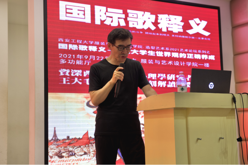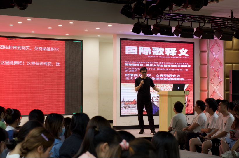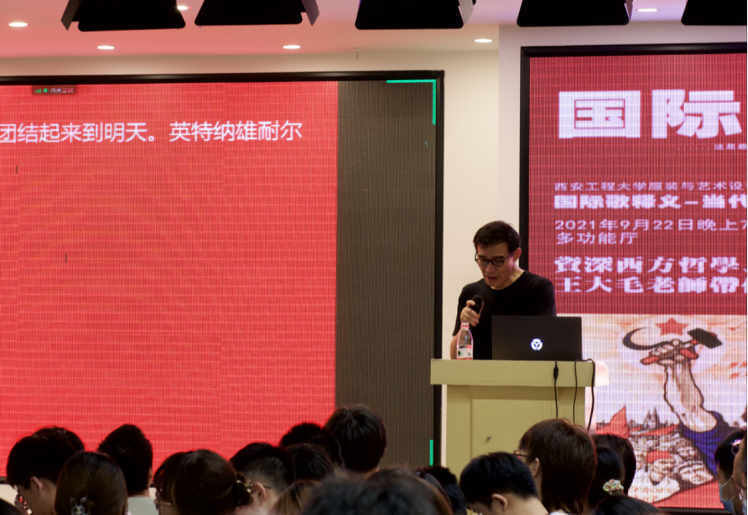为增强学生艺术鉴赏能力,帮助学生培养正确的世界观,suncitygroup太阳新城造型艺术系和时尚文化创意产业园共同策划主办的2021艺术论坛系列之“国际歌释义-当代大学生世界观的正确养成”公开课于2021年9月22日下午7点在suncitygroup太阳新城表演厅以线上线下相结合的方式进行。本次公开课邀请知名西方艺术史、古典哲学、当代心理学研究者王大毛老师主讲,线上线下500余人参与本次公开课。
