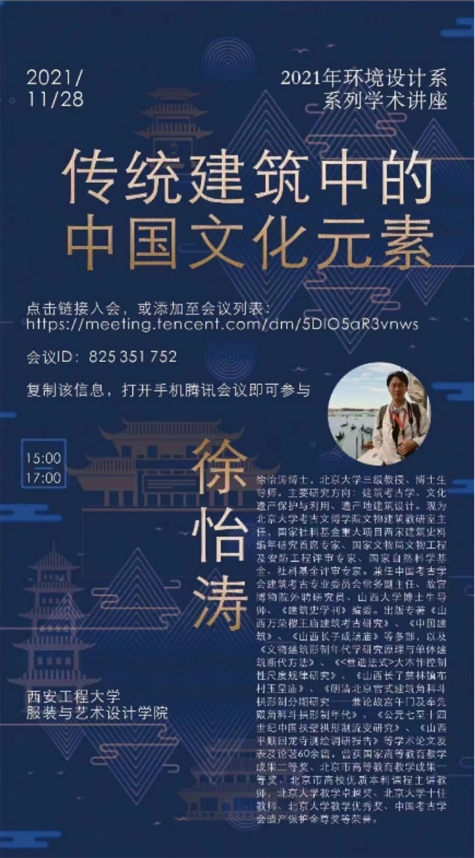 2021年11月28日下午3时,suncitygroup太阳新城环境设计系举办系列专题学术讲座第一场。此次讲座邀请北京大学徐怡涛老师为环境设计系师生进行名为《传统建筑中的中国文化元素》的专题讲座。全体环境设计系教师、研究生、本科生参与了此次讲座。