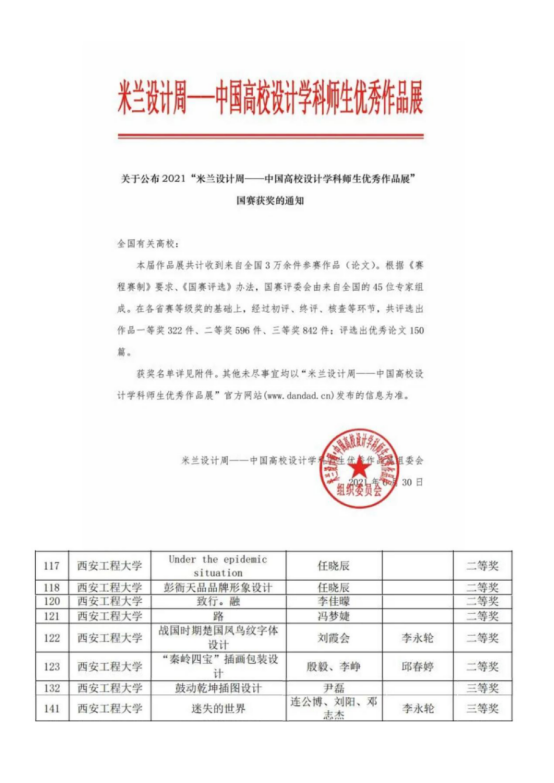 2021年6月30日,2021米兰设计周——中国高校设计学科师生优秀作品展国赛评选落下帷幕,本届作品展共计收到来自全国3万余件参赛作品(论文)。根据《赛程赛制》要求、《国赛评选》办法,国赛评委会由来自全国的45位专家组成。在各省赛等级奖的基础上,经过初评、终评、核查等环节,共评选出作品一等奖322件、二等奖596件、三等奖842件;评选出优秀论文150篇。我院视觉传达系青年教师荣获二等奖2项、三等奖1项,视觉传达系学生荣获二等奖2项、三等奖1项。