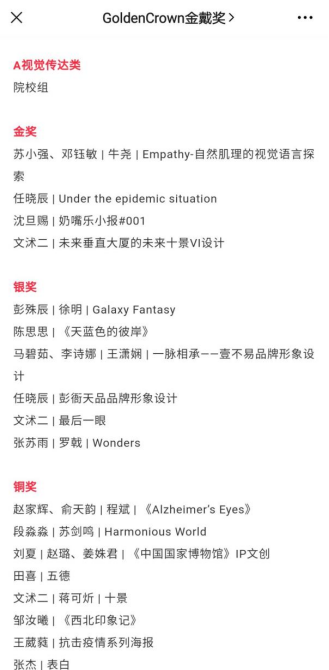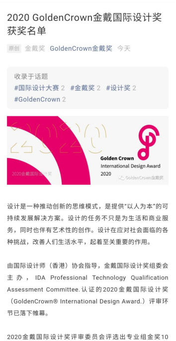 2021年5月5日,2020 GoldenCrown金戴国际设计奖落下帷幕,来自港澳台、亚太地区、全球范围的美术院校专业教师、设计专业学生、应届毕业生参加这次比赛,最终评选出专业组金奖10件,银奖15件,铜奖20件,提名奖37件;院校组金奖11件,银奖15件,铜奖23件,提名奖48件。我院视觉传达系青年教师任晓辰的作品《Under the epidemic situation》荣获视觉传达类金奖、《彭衙天品品牌形象设计》荣获视觉传达类银奖。