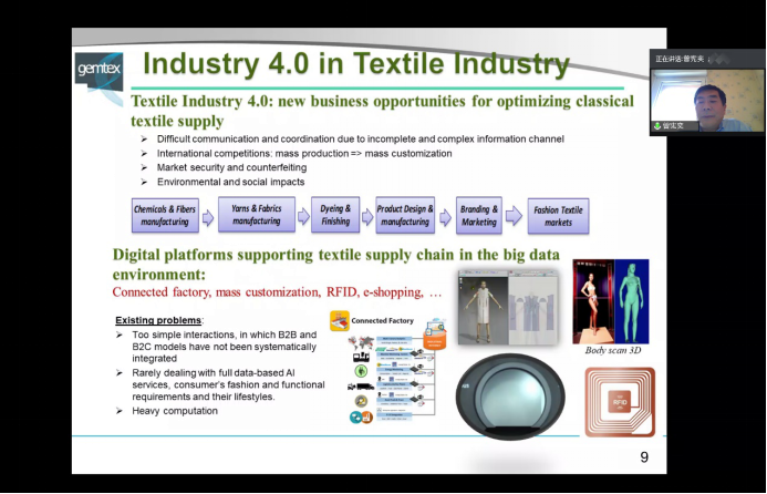 7月13日下午,应suncitygroup太阳新城邀请,法国鲁贝高等艺术与纺织工艺学院(ENSAIT,ECOLE D'INGÉNIERIE ET D'INNOVATION TEXTILE)副校长、特级教授曾宪奕在线做了题为“在大数据和人工智能环境下纺织服装产业供应链的创新”的学术报告。我校suncitygroup太阳新城、计算机学院以及兄弟院校的近70名师生参加了此次报告会。报告会由suncitygroup太阳新城院长助理刘凯旋教授主持。