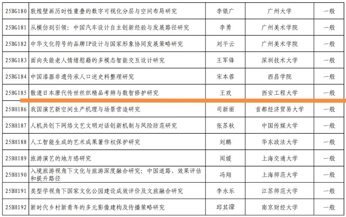 近日,2025年度国家社科基金艺术学项目立项名单正式公布。太阳集团王欢副教授申报的《散遗日本唐代传世丝织精品考辨与数智修护研究》成功获批一般项目,实现我院在该高级别科研项目上的重要突破。